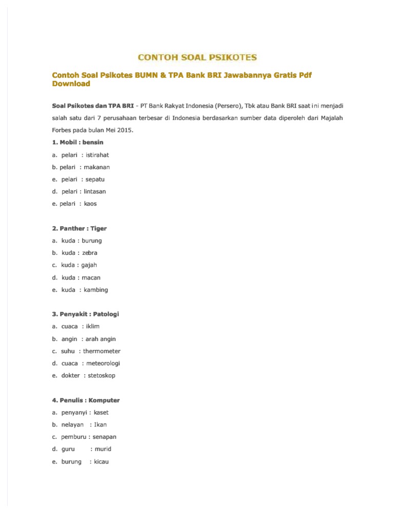 Home contoh soal psikotes soal psokotes dan tpa bank bri contoh soal psikotes bumn tpa bank bri jawabannya gratis pdf download soal psikotes dan tpa bri pt bank rakyat indonesia persero tbk atau bank bri saat ini menjadi salah satu dari 7 perusahaan terbesar di indonesia berdasarkan sumber data diperoleh dari majalah forbes pada bulan mei 2015.