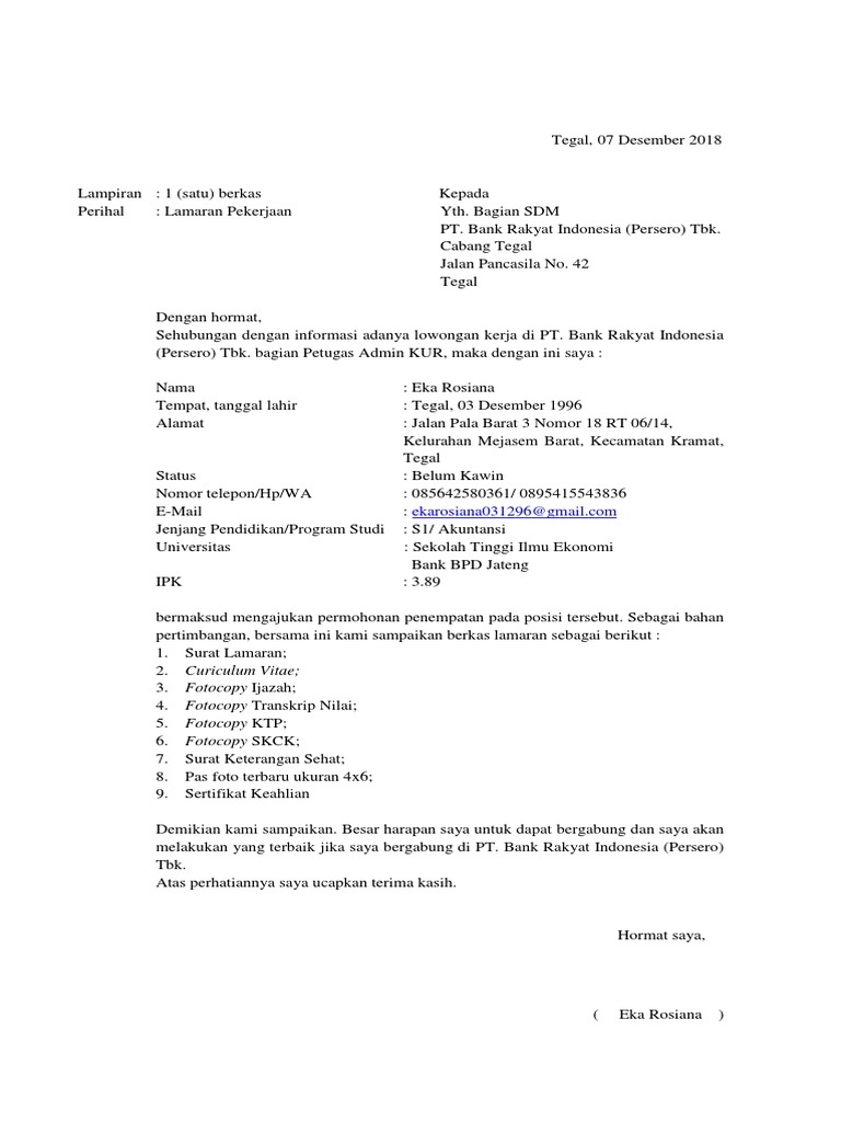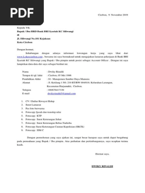 Contoh surat lamaran kerja di bank bri