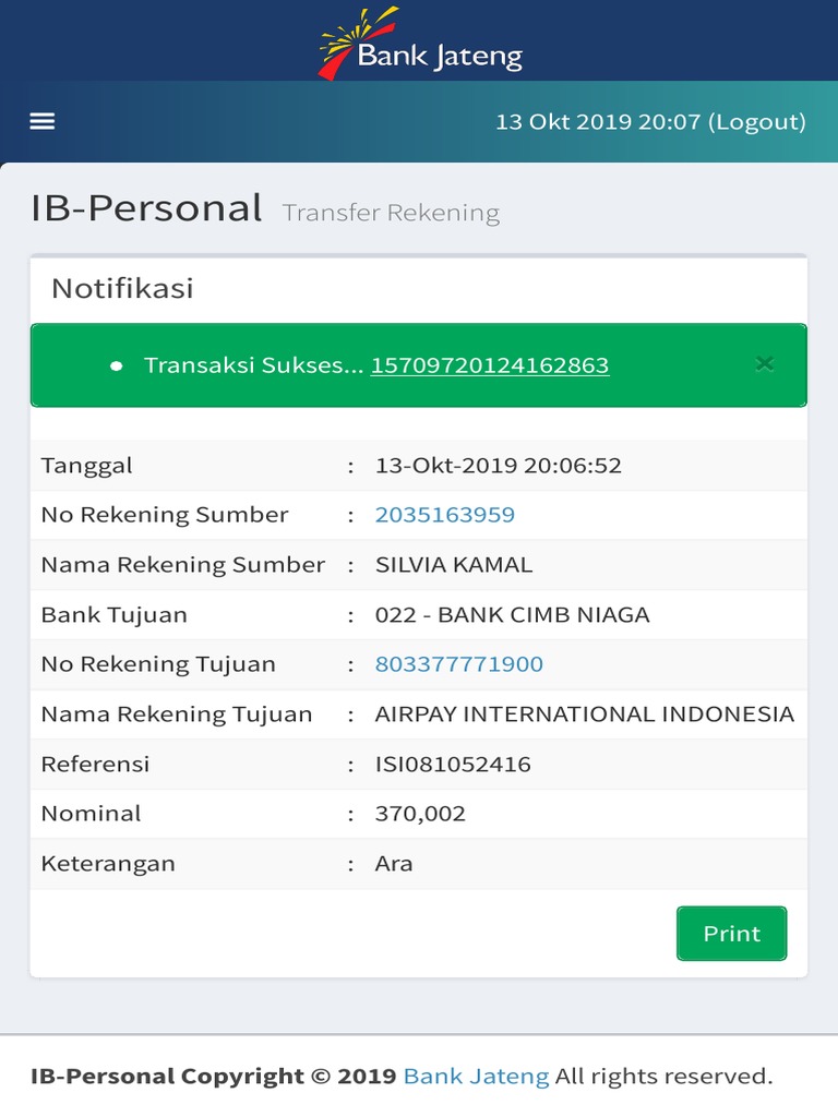 Bank Jateng: jawa_timur: Bank Jatim: jambi: Bank Jambi: sumut: Bank Sumut: sumatera_barat: Bank Sumbar (Bank Nagari) riau_dan_kepri: Bank Riau Kepri: ... The receipt will be a screenshot taken from the internet banking interface of each bank. This attribute will only show the url when the status is DONE: time_served: