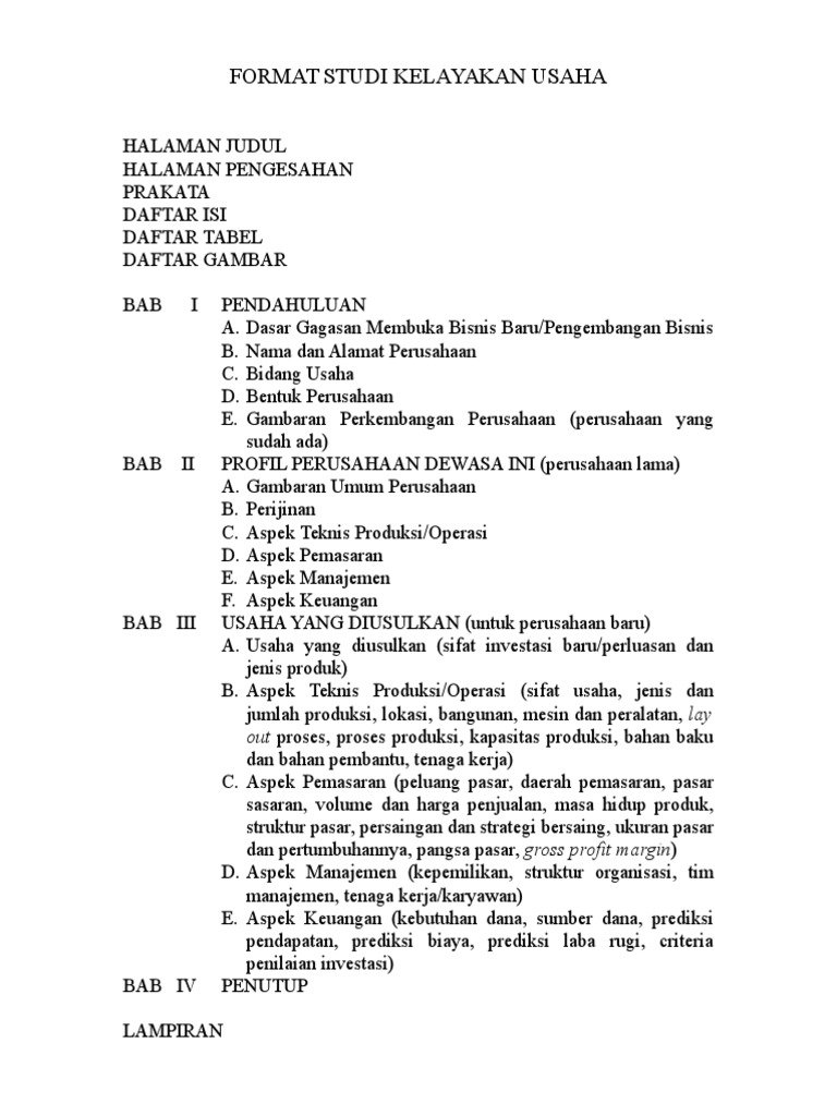 Contoh laporan studi kelayakan bisnis. Feb 25, 2019 — JASA KONSULTAN STUDI KELAYAKAN, SKEMA PENDANAAN ... Memberikan laporan mengenai jadwal ... Laporan kajian bisnis seluruh koridor LRT.11 pages by H Handy · 2013 — Handy, Handy (2013) Proposal Studi Kelayakan Bisnis Restoran Yum Cha Dim Sum di Mall @ Alam Sutera Tangerang Selatan. Sep 12, 2013 — Analisis kuantitatif : menggunakan model2 statistik seperti analisis regresi, least square dan model2 perhitungan laporan keuangan. Cara ... 21/ago/2015 - Contoh Bisnis Plan, Berisikan halaman tentang Rencana Laporan keuangan, Studi Kelayakan Bisnis (Feasibility Studies), Strategi Pemasaran, ...