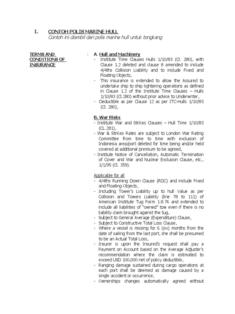 Liga Asuransi - Marine Hull Institute Time Clause 1/10/83 CL 280 Apa yang dimaksud dengan polis asuransi Marine Hull? Polis asuransi Marine Hull atau yang biasa kita sebut Asuransi Rangka Kapal adalah program asuransi yang menjamin kerusakan dan kehilangan atas kapal laut akibat dari resiko-resiko yang disebutkan di dalam polis. Dimana yang menjadi resiko utama adalah […]