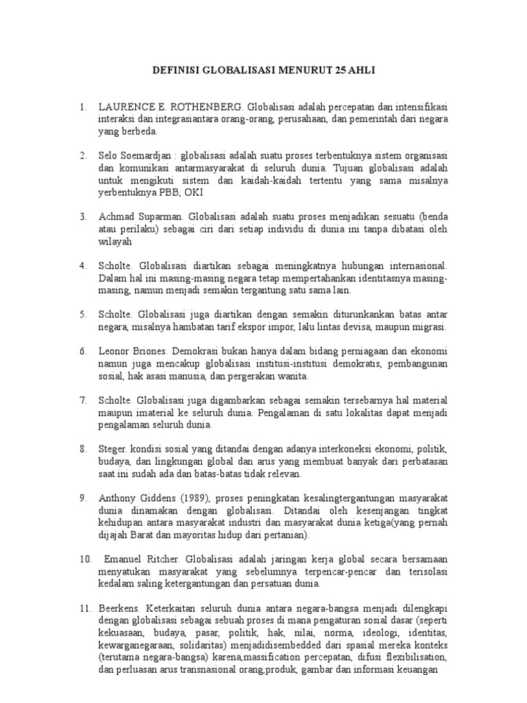 Materi Globalisasi : Pengertian, Teori, Ciri, Faktor, Macam, Dampak & Contohnya Lengkap - Pengertian Globalisasi adalah proses integrasi internasional yang terjadi karena adanya.. ... Rekonsiliasi Bank. Cara Cek Bansos. ... globalisasi membuat masyarakat di dunia bisa, globalisasi politik menurut para ahli, hubungan antara keteraturan dan norma ... Pengertian sederhana globalisasi oleh bank dunia adalah kebebasan dan kemampuan individu dan perusahaan untuk memprakasi transasksi ekonomo dengan orang-orang negara lain. meski terkesan sederhana tetapi pernyataan tersebut sudah menyentuh essential dari apa itu globalisasi yang sesungguhnya terlepas dari isu budaya dan lain sebagainya. A. Pengertian Globalisasi. Sekarang mari kita bahas pengertian globalisasi menurut para ahli seperti yang dijelaskan di bawah ini. • Selo Soemardjan. Globalisasi adalah suatu proses terbentuknya sistem organisasi dan komunikasi antara masyarakat di seluruh dunia, tujuannya untuk mengikuti sistem dan kaidah-kaidah tertentu yang sama ... Pengertian Globalisasi Menurut Para Pakar. Baca Juga: Apa yang Dimaksud dengan Globalisasi? Ini Pengertian dan Dampaknya. Menurut Kamus Besar Bahasa Indonesia, globalisasi dapat dipahami sebagai proses masuknya informasi, pemikiran, gaya hidup, serta teknologi ke ruang lingkup dunia.