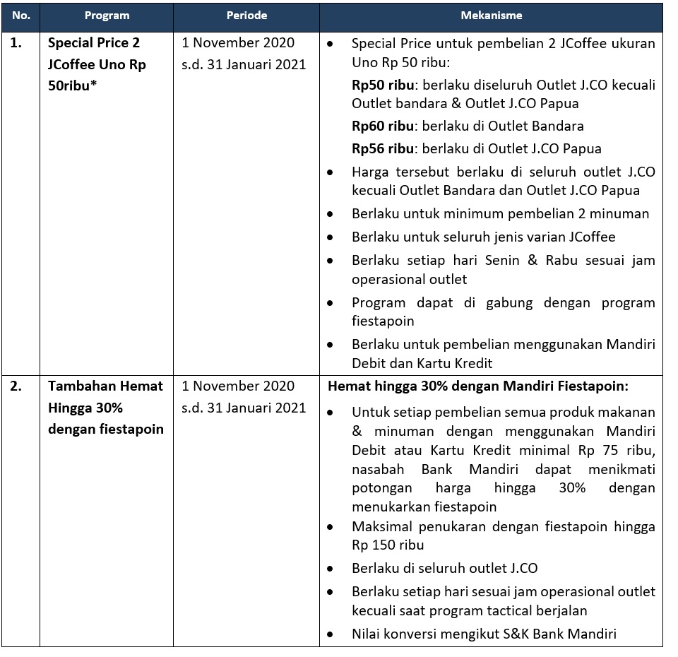 Apa yang dimaksud "Promo I LOVE JCO - Harga Spesial Rp107 ribu atau Rp52 ribu di J.CO dengan Mandiri Debit atau Kartu Kredit"? Yaitu program kerjasama antara Bank Mandiri dengan J.CO yang memberikan penawaran berupa harga spesial Rp105 ribu atau Rp52 ribu untuk pilihan menu tertentu, dengan detail mekanisme sebagai berikut :
