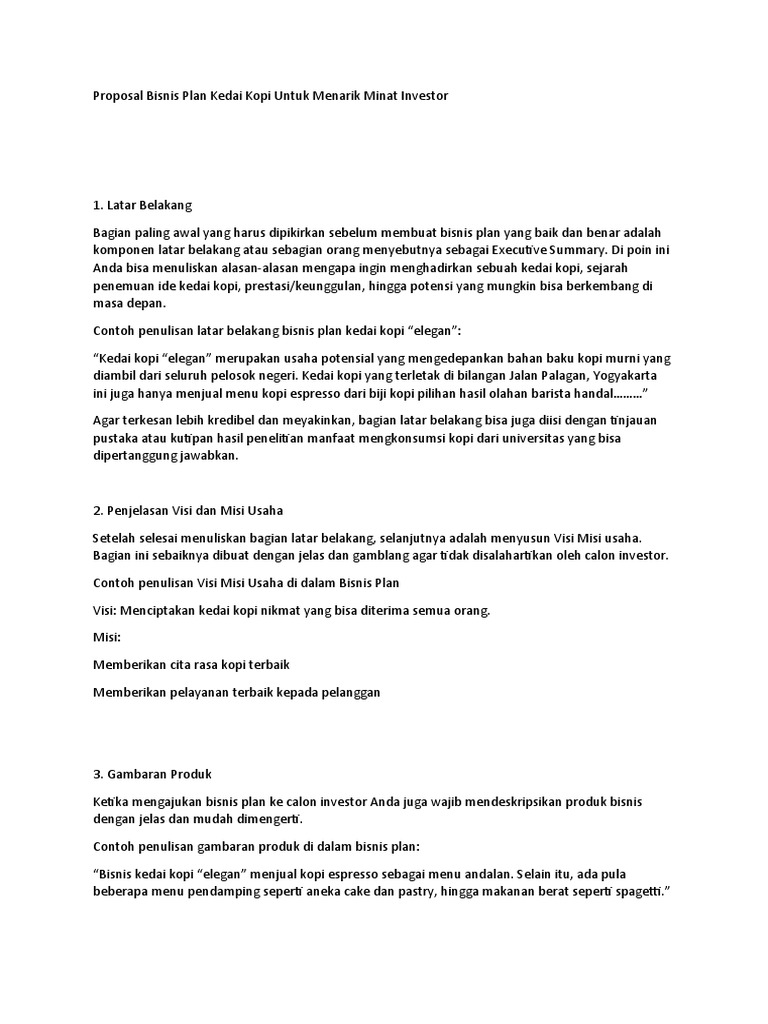 Detail produk, manajemen produksi dan kegiatan operasional, serta rencana biaya akan dijelaskan lebih lanjut pada setiap bagian dalam Bisnis Plan ini. Profil Bisnis Kedai Kopi Ruli memiliki keunikan pada lokasi, produk dan pengalaman yang didapatkan konsumen saat menikmati kopi. pada dasarnya masih terdapat peluang bagi kedai-kedai kopi kecil untuk masuk pada pasar ini. Hal ini terbukti dengan eksisnya beberapa kedai kopi seperti Coffee Bean, Cafe Oh La La, Excelso, dan lain- kopi dengan atmosfer kedai bar untuk menikmati ritual minum kopi menjadi sebuah kesenangan. Contoh Proposal Usaha Kedai Kopi kami tersebut sudah Sangat Layak untuk Harga Rp 250.000,- Dengan dana Rp. 250.000,-Anda berpeluang mendapatkan Pinjaman Modal Usaha Puluhan….bahkan Ratusan Juta…. Dengan Rp 250.000,- Anda Tidak perlu Pusing-pusing ataupun melakukan Trial Error, Buang Waktu, Buang Tenaga, Buang Modal,dll 10.03.2019 · Studi Kelayakan Bisnis (Kedai Kopi Bang Ben) 1. PROPOSAL STUDI KELAYAKAN BISNIS “KEDAI KOPI BANG BEN” Proposal ini dibuat untuk memenuhi tugas kelompok pada mata kuliah Studi Kelayakan Bisnis Didi Sujadi, S.E., M.M. Oleh : Kelompok II Almas Izzaty Syahida 2016121203 Febby Agustini Armeliya 2016120146 Moch. Syawal …