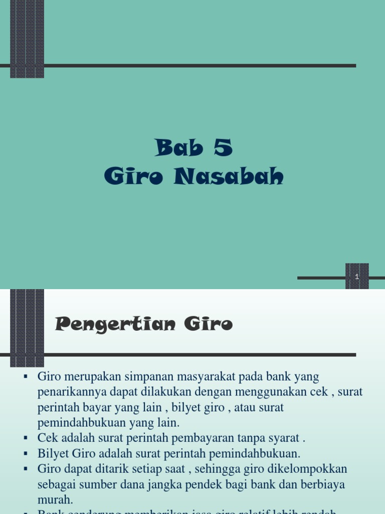 Jenis Simpanan: Tabungan, Deposito, dan Giro - Glints Blog Giro adalah produk simpanan bank yang penarikan dananya bisa diambil setiap waktu dengan menggunakan cek atau bilyet giro. Bank Indonesia mendefinisikan giro sebagai simpanan yang penarikannya dapat dilakukan setiap saat dengan menggunakan cek, bilyet giro, sarana perintah pembayaran lainnya, atau dengan pemindahbukuan. Ada dua jenis simpanan giro.