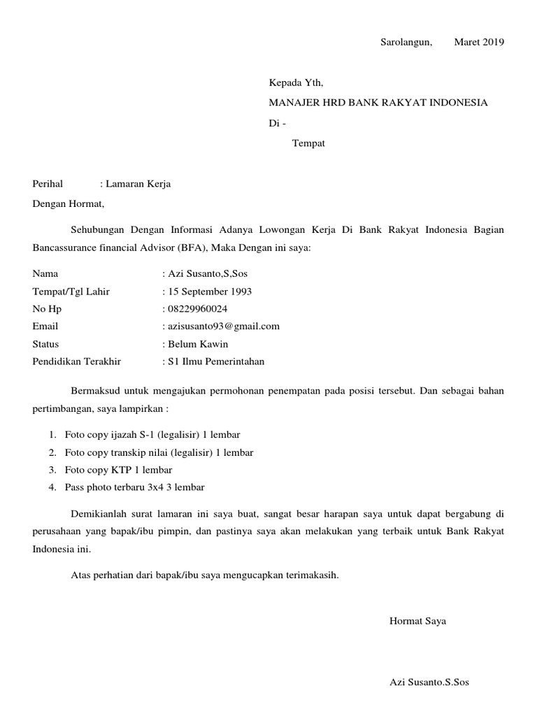 Contoh Surat Lamaran Kerja di Bank BRI - Contoh Surat ... Maka dari itu berikut ada beberapa tips cara membuat surat lamaran kerja di bank yang baik dan benar : 1. Gunakanlah bahasa yang baik dan benar yang sesuai EYD. Hindari penggunaan bahasa gaul yang susah dimengerti secara umum. 2. Buatlah surat lamaran kerja dengan susunan kata-kata dan kalimat yang sopan dan tidak terkesan menyombongkan diri. 3.