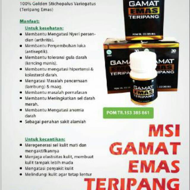 MSI GAMALIFE GOLD Gamat Emas Teripang Original Obat Herbal... Gamat emas teripang MSI. Sekarang Ganti nama menjadi GAMALIFE GOLD. komposisi 100% Golden Stichopalus Variegatus (Teripang Emas), Spesies Goldeen Stichopus Variegatus yang merupakan spesies terbaik yang hidup di dasar samuder.