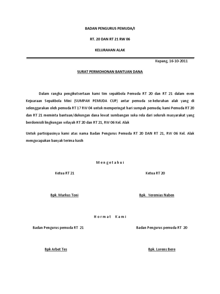 Proposal permohonan dana sepak bola. 15 Contoh Surat Permohonan Dana Paling Lengkap - Suratresmi.id Surat permohonan dana biasanya dibuat saat ingin membuat kegiatan tertentu. Untuk anda yang saat ini berkecimpung dalam dunia organisasi tentunya Untuk mendapatkan bantuan dana dibutuhkan proposal dan surat permohonan dana. Panitia pengembangan bangunan masjid... Proposal permohonan bantuan dana yayasan rumah... 1 proposal permohonan bantuan dana oleh : yayasan rumah sakit islam ntb sekolah menengah kejuruan mataram. 2 2012 KATA PENGANTAR Segala puji dan syukur kami panjatkan kehadapan Allah SWT yang telah memberikan berkat dan rahmat-nya kepada kami... Contoh proposal permohonan dana | pemuda karang taruna Sepak bola. Pengajian. Gotong royong. Contoh proposal permohonan dana. Posted by Zona Bebas.net Posted on 03.38 with No comments. Demikian proposal pengajuan bantuan dana ini kami sampaikan, sudilah kiranya Bapak untuk dapat memperhatikan serta kami... (DOC) Contoh proposal permohonan dana lapangan sepak bola Download Free PDF. Contoh proposal permohonan dana lapangan sepak bola. J. TARGET KINERJA - Terciptanya reaktualisasi potensi di bidang olahraga khususnya Bola kaki -Terwujudnya suatu sarana prasarana olah raga yang memadai untuk menunjang kegiatan olah raga Bola kaki.