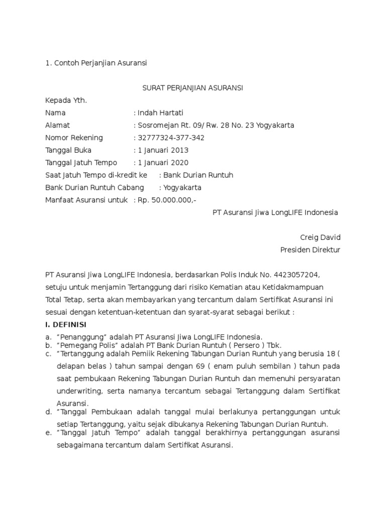 306138355-Contoh-Surat-Perjanjian-Asuransi-1.doc - 1 ... 1. Contoh Perjanjian Asuransi SURAT PERJANJIAN ASURANSI Kepada Yth. Nama: Indah Hartat Alamat: Sosromejan Rt. 09/ Rw. 28 No. 23 Yogyakarta Nomor Rekening : 32777324-377-342 Tanggal Buka : 1 Januari 2013 Tanggal Jatuh Tempo : 1 Januari 2020 Saat Jatuh Tempo di-kredit ke : Bank Durian Runtuh Bank Durian Runtuh Cabang : Yogyakarta Manfaat Asuransi untuk : Rp. 50.000.000,-PT Asuransi Jiwa LongLIFE ...