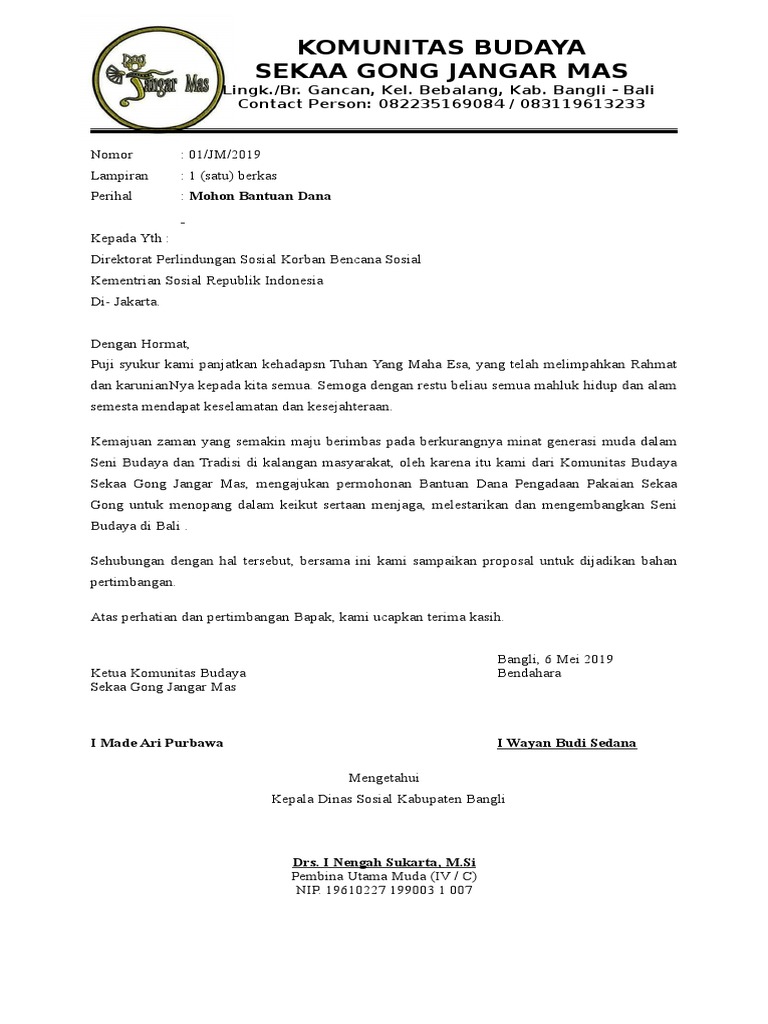 trenggalekpedia.pikiran-rakyat.com › pendidikan › prContoh Proposal Pembangunan Masjid Format Doc, Terbaru 2022 ... Feb 15, 2022 · Contoh Proposal Kegiatan 17 Agustus PDF Lengkap, Tinggal Copas dan Modifikasi; Proposal Kegiatan Organisasi, Ini Contoh Proposal Kegiatan Organisasi Agar Pengajuan Dana di ACC; Contoh Proposal Penelitian Tentang Covid-19 Lengkap Dengan Tujuan dan Strukturnya; Contoh Proposal PKM Kewirausahaan, Ini Isi Proposal PKM yang Bakal Lolos DIKTI › 2020 › 05Contoh Proposal Kegiatan Peringatan Isra' Mi'raj Dan Download ... May 18, 2020 · Contoh Proposal Kegiatan Sekolah Yang Baik Dan Benar – Buat kamu yang belum tahu, kata proposal berasal dari bahasa Inggris, yaitu Propose yang artinya pengajuan atau mengajukan atau permohonan. Suatu pihak memberikan proposal untuk menawarkan ide, gagasan, atau rencana kepada pihak lain agar mendapatkan dukungan. Contoh proposal pengajuan dana sponsor s proposal permohonan... contoh proposal pengajuan dana sponsor.doc. Pengusaha21gmail.com contoh sampel langsung ke alamat saya. Contoh Surat Permohonan Bantuan Dana Silahkan download file. Atausumbangan dana biasanya diajukan beserta proposal bantuan. CONTOH PROPOSAL PENGAJUAN BANTUAN DANA.docx There is document - CONTOH PROPOSAL PENGAJUAN BANTUAN DANA.docx available here for reading and downloading. Use the download button below or simple online reader. The file extension - PDF and ranks to the Documents category.