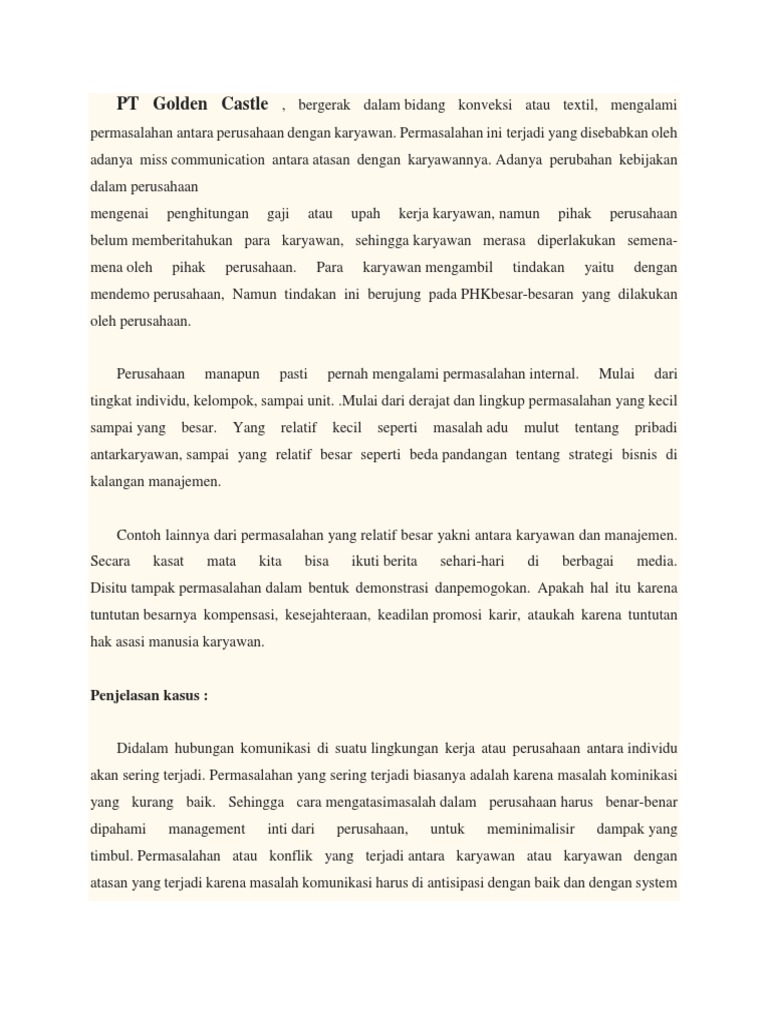 Kepmendagri 050 - 5889 Tahun 2021 | PDF MENTERI DALAM NEGERI REPUBLIK INDONESIA. KEPUTUSAN MENTERI DALAM NEGERI NOMOR 050-5889 TAHUN 2021 TENTANG. HASI L VERI FIKASI, VALIDASI DAN II{VENTARISASI PEMUTAKHIRAN KLASI FIKASI, KOD EFIKASI DAN NOMENKLATUR PERENCANAAN PEMBANGUNAN DAN KEUANGAN DAERAH. MENTERI DALAM NEGERI, … Contoh Kasus Komunikasi Contoh Kasus Komunikasi. PT Golden Castle , bergerak dalam bidang konveksi atau textil, mengalami permasalahan antara perusahaan dengan karyawan. Permasalahan ini terjadi yang disebabkan oleh adanya miss communication antara atasan dengan karyawannya. Adanya perubahan kebijakan dalam perusahaan mengenai penghitungan gaji atau upah kerja ...