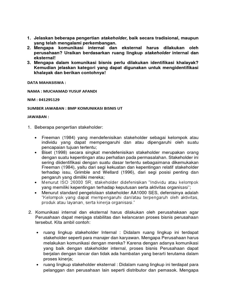 Komunikasi Eksternal: Jenis, Contoh, Pentingnya - Belajar ... 1. Komunikasi Bisnis Eksternal Formal: dianggap sebagai elemen awal dalam membangun citra perusahaan yang sesuai. Ini termasuk berbagai surat formal, memo, laporan, atau presentasi. Tujuan utama komunikasi eksternal dalam bisnis adalah untuk mendekatkan pekerjaan dan kualitas produk atau layanan bisnis ke lingkungan eksternalnya. Komunikasi Bisnis yang Efektif - Ruang Lingkup dan Tujuan ... Komunikasi Bisnis merupakan komunikasi yang digunakan untuk membangun hubungan antar perusahaan dalam dunia bisnis. Hal ini dilakukan guna saling mempromosikan atau mempresentasikan suatu nilai produk atau jasa yang dimiliki oleh perusahaan kepada pihak buyer maupun perusahaan lain yang hendak melakukan kerjsama dengan perusahaan yang terkait. KOMUNIKASI BISNIS : Pengertian, Tujuan, Proses, Contoh ... Dalam hal ini, komunikasi bisnis memiliki enam unsur pokok yaitu : 1. Tujuan, komunikasi bisnis memiliki tujuan yang telah ditetapkan dan sejalan dengan tujuan organisasi. 2. Pertukaran, dimana pertukaran ini melibatkan dua orang bahkan lebih yaitu komunikator dan komunikan. 3.