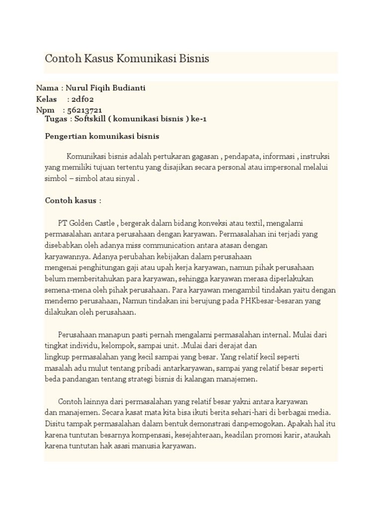 Contoh Kasus Permasalahan Komunikasi Bisnis Perusahaan Apple Semua aktivitas yang terorganisir dalam suatu perusahaan bergantung pada proses komunikasi bisnis. Herdian Shalahudin 0211-11-126 4. PT Golden Castle bergerak dalam bidang konveksi atau textil mengalami permasalahan antara perusahaan dengan karyawan. 5 poin ini akan sangat sederhana namun karena dieksekusi dengan baik maka sangat berpengaruh ...