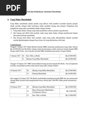 Macam-Macam Akad Syariah dalam Sistem Ekonomi Islam Jenis akad syariah pertama adalah murabahah.Murabahah sendiri adalah akad transaksi di mana penjual menyatakan harga beli produk kepada pembeli dan pembeli membeli dengan harga lebih sebagai perolehan laba penjual.. Keuntungan harga akan disepakati oleh kedua belah pihak. Sehingga pihak pembeli mengetahui harga beli produk dan margin keuntungan yang didapatkan oleh penjual. Skema Murabahah Dalam Perbankan Syariah - Islampos Dalam skema diatas, penulis memberikan contoh skema murabahah untuk pembiayaan kendaraan, dan berikut penjelasannya: 1. Terjadinya negosiasi dan persyaratan antara bank dengan nasabah dimana semua harga dan ketentuan-ketentuan lainnya disepakati disini. 2. (DOC) AKUNTANSI TRANSAKSI MURABAHAH | Siti Arda - Academia.edu Contoh 1: Pada 1 Februari 2015, PT RET Bank Syariah (Bank) membeli sebuah mobil senilai Rp 300 juta karena adanya perjanjian akad murabahah berdasarkan pesanan salah satu nasabahnya. Pembayaran ke Bank akan dilakukan dengan cicilan sesuai akad. Pengaplikasian Murabahah di Perbankan Syariah - Kompasiana.com Contoh aplikasi murabahah di perbankan syariah Pembiayaan konsumtif: meliputi Pembiayaan Kepemilikan Rumah, Pembiayaan kepemilikan Mobil, Pembiayaan Pembelian Perabot Rumah Tangga.